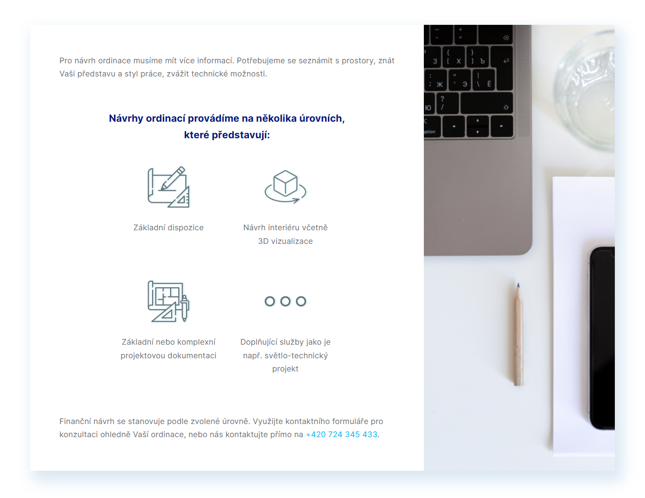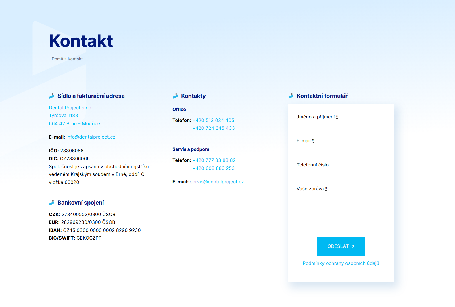 Sekce Reference & Kontakt nabízí esenciální firemní údaje (IČO, bankovní spojení) a kontaktní kanály včetně oddělení servisu a technické podpory. Web je optimalizován pro lead generation – kontaktní formulář a přímé call-to-action tlačítka pro návrhy ordinací či objednávky vybavení.