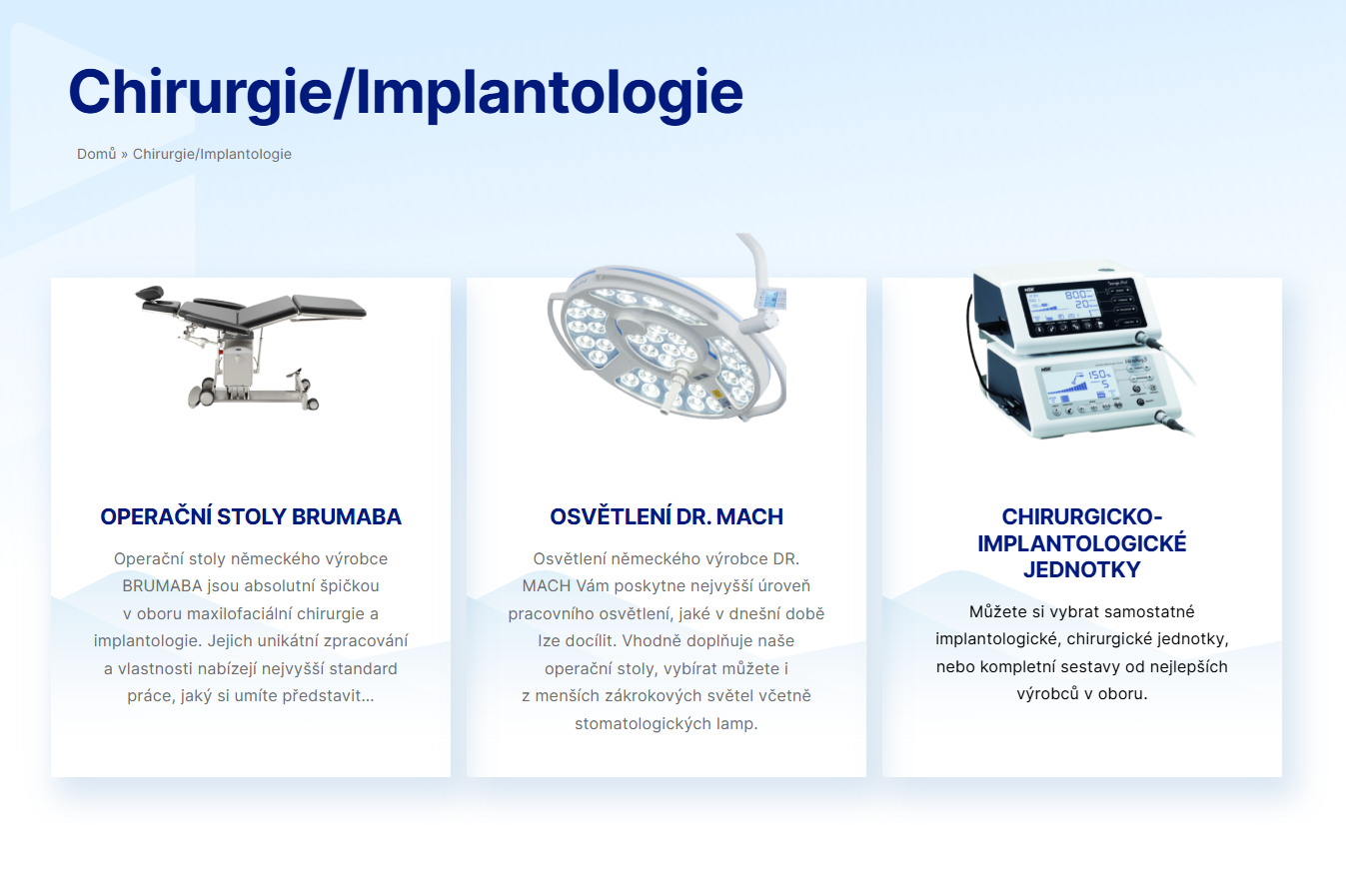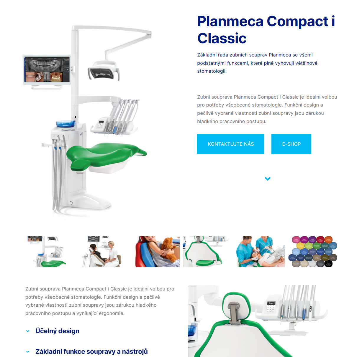 Každá kategorie (např. Zubní soupravy – Planmeca, Mikroskopy – CJ Optik Flexion, Židle – BRUMABA) má vlastní stránku s technickými detaily, fotografiemi, možností stáhnout soubory nebo kontaktovat odborného poradce. Například stránka mikroskopu Flexion popisuje ergonomii, LED světlo s 56 000 luxů, 12,5× okulár a možnosti instalace