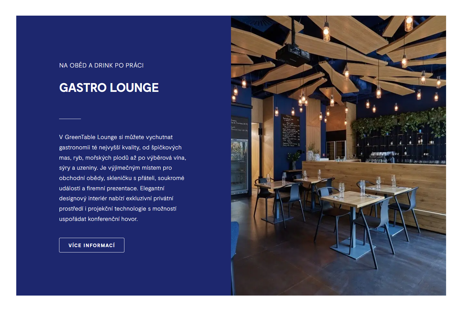 Web dominuje úvodní přehled tří jasně oddělených sekcí – Bistro, Lounge a Cowork/Events. Každá část má vlastní podstránku představující atmosféru místa, filozofii a služby: bistro zdůrazňuje sezónní vegetariánské menu a udržitelný přístup, lounge nabízí kvalitní gastronomii a privátní prostředí pro after-work chvíle, zatímco coworking a eventy nabízejí flexibilní pronájem zasedacích místností či celého prostoru s technikou a cateringem.