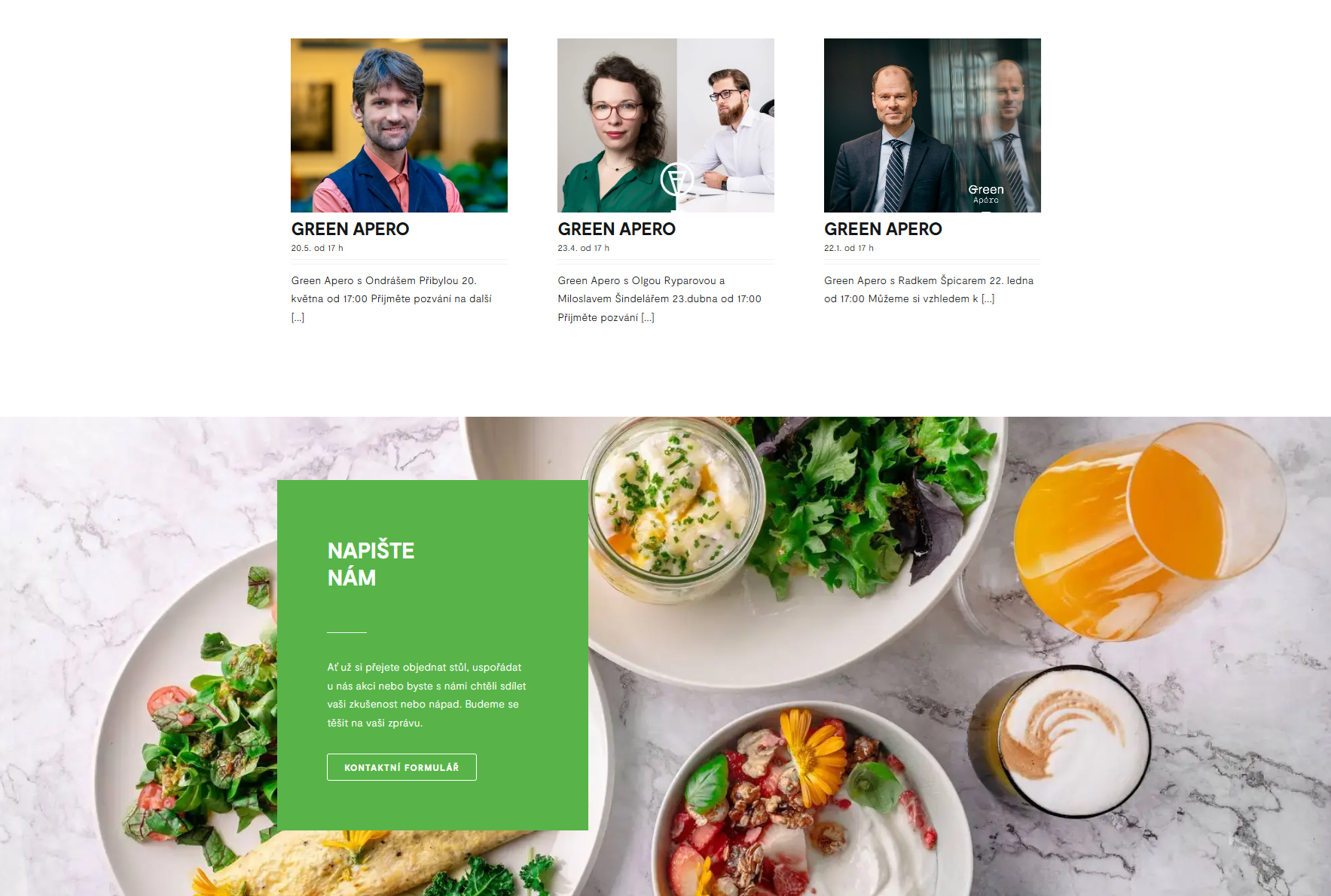 Sekce Program akcí / Green Apéro detailně popisuje pravidelné akce – diskuzní večery, workshopy, společenské události i dětský příměstský tábor, čímž web dávkuje autentický obsah a podporuje komunitní atmosféru. Interaktivní formulář pak usnadňuje rezervace stolů či pronájem prostor.