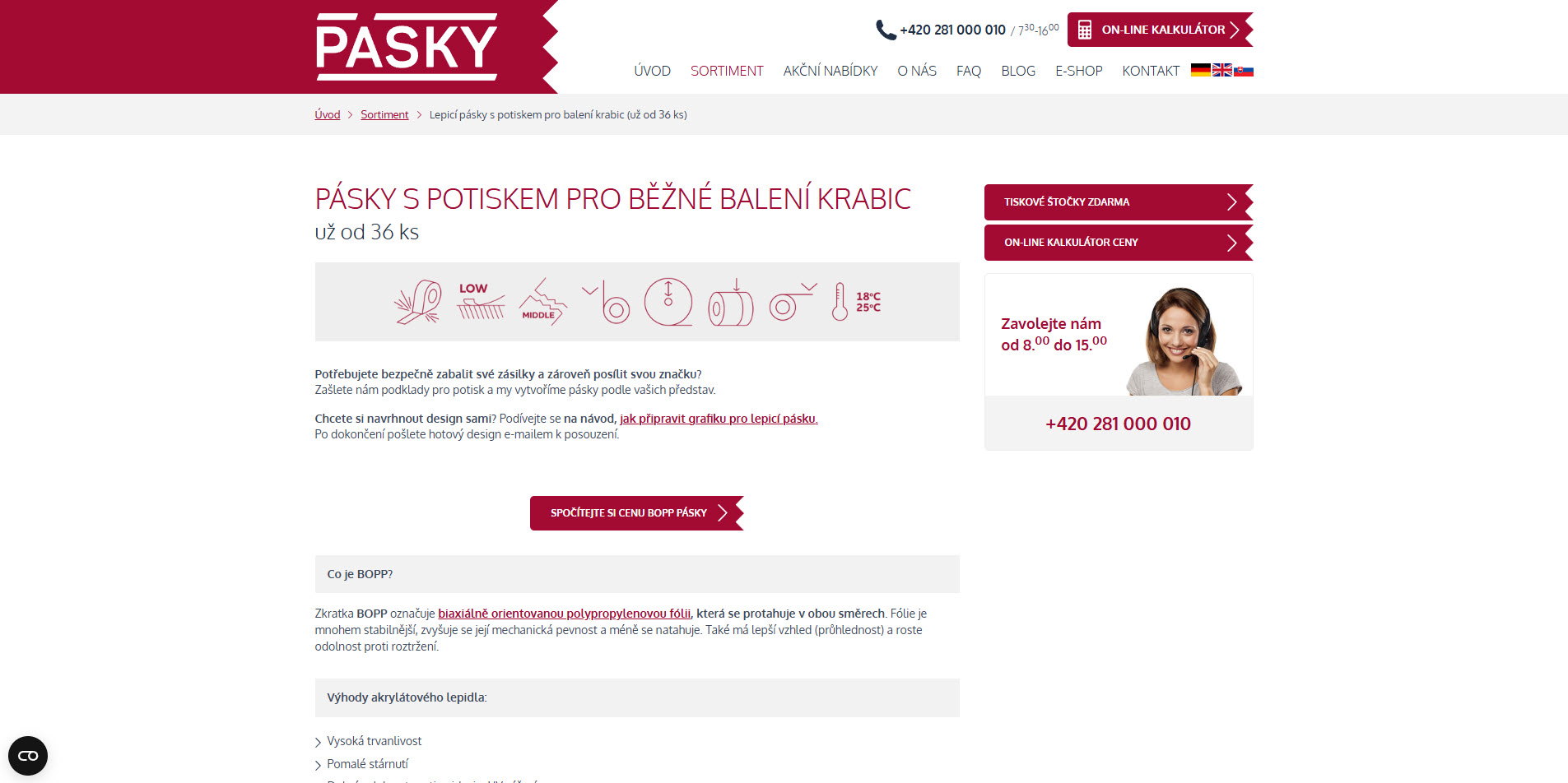 Společnost Pásky s.r.o. se specializuje především na výrobu a potisk různých typů lepicích pásek, včetně flexotisku, papírových pásek, LDPE fólií a navlhčovacích pásek.
